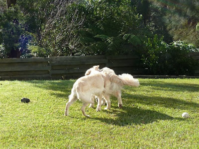• we have to stop immediately when she says "Enough" until she says it is "OK" for us to play again (or if we are getting too energetic or tired, she gets us to do something else like a few sits or some heal work and then we all go inside)